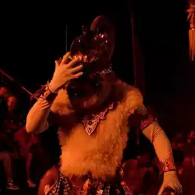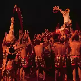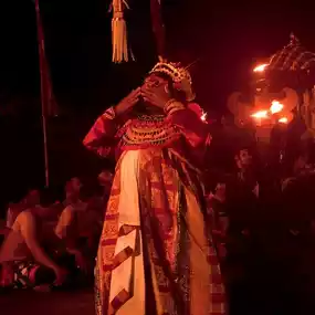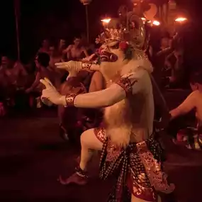 During the performance of Gamelan music, a team of performers continuously uttered the rhythmic sounds of "Cak! Cak! Cak!" or "Keh-Chak" to represent the monkey's calls. Another highlight is the scene where the monkey looks at the performers breaking out of the fire surrounding him.
