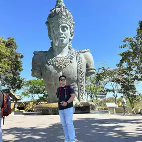 After landing at Bali airport, the car we had arranged to pick us up. We were hungry, so we looked for a restaurant and had a little lunch. Then we continued to our first destination, Vishnu Park, a large and magnificent park with a bronze statue of Lord Vishnu on Garuda, standing out majestically against the colorful sky. There was a constant breeze and the sun was quite strong. I would like my friends to come and see it. #VisitBali #PlacesToVisitBali #TravelWithKorn #Balitrip