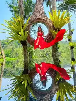 We are now situated at the heart nest and the bird nest at Swing Heaven, a captivating destination in Bali. This prime location allows us to be perched atop a cliff, granting us a breathtaking view of the lush, verdant jungle that sprawls out before us.