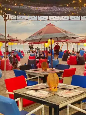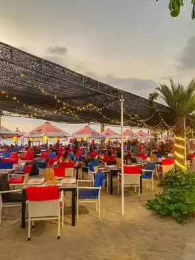 There were many areas to sit on, over the sand for drinks and snacks and on tables and chairs for proper food on the table.