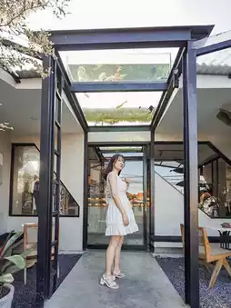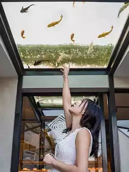 This cafe is like an aquarium, with a fish tank on the ceiling, so the fish swimming inside look like they're swimming in the sky.