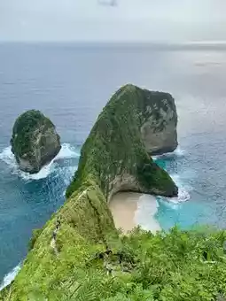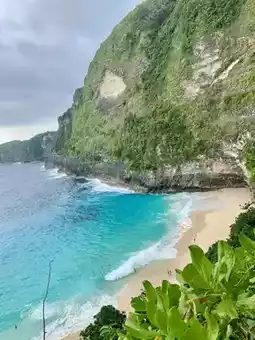 Kelingking Beach is one of the most famous beaches on Nusa Penida Island in Indonesia, especially for its beautiful view that looks like a dinosaur. The high cliffs and crystal blue sea contrast with the green trees.