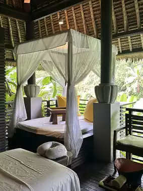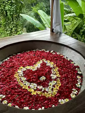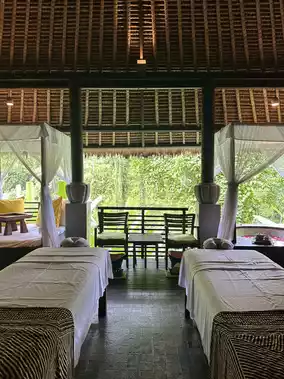Maya Ubud Spa is located inside Maya Ubud Resort. It is famous for its massages, so many people make reservations not only from guests but also from outside. We also made a reservation in advance when we checked in! At Maya Ubud Spa, you can receive a massage while listening to the sound of the stream flowing in the jungle, and after the massage, you can also take a flower bath with warm tea and a light snack. 🌸 I recommend it because the massage is good and the atmosphere is good. 🫶🏻