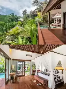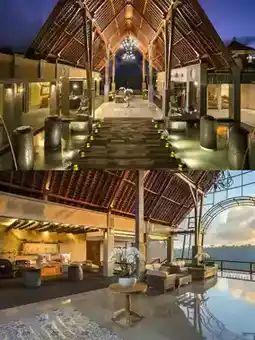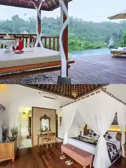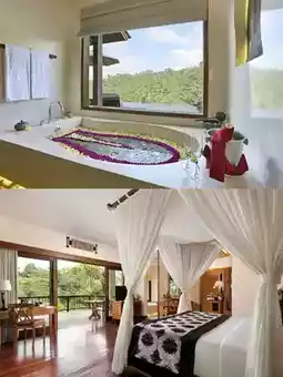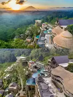 Kayon Jungle Resort is located deep in the dense jungle, surrounded by towering trees that block out the sun, with sunlight filtering through the leaves to form patches of golden light. Walking along the winding paths, wooden cabins are scattered around, each like a gift from nature, perfectly blending with the surrounding environment. The interior decoration is simple yet cozy, with rattan furniture and cotton curtains exuding a rustic charm, making people instantly forget the outside world and immerse themselves in this tranquil atmosphere.