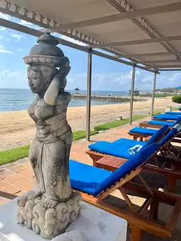 Stay in a sea view room and enjoy the stunning sea view and sunrise from the terrace every day 🌅. The bathroom is very spacious, with a separate bathtub. Enjoy the sunbeds by the pool, and the happy hour at Aloha Bar is particularly memorable. A short taxi ride will take you to Kuta and Legian. Breakfast and dinner offer a wide variety of delicious food, perfect for couples on their honeymoon 💑.