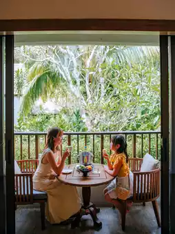 🛏️ The suite is very spacious, with a large sofa bed outside. The hotel thoughtfully prepared a welcome gift. Very comfortable for two adults and two children. The hotel has several pools where kids can play. The family pool water temperature is especially warm. There’s also a slide 🛝 and a warm water jacuzzi. Kids can enjoy water play without worrying about the rainy season. Bali-style stone statues are seen throughout the pool, adding lots of fun for the kids. The adult pool near the beach is great for taking beautiful photos. There’s also a kids’ club with staff accompanying the children throughout, organizing crafts and feeding ducklings.