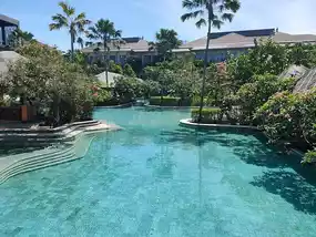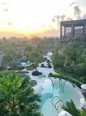 Movenpick Jimbaran is located in the picturesque Jimbaran, just 4 kilometers from Ngurah Rai International Airport. The hotel is close to Jimbaran Beach, only a 10-minute walk away. The hotel features a stylish and modern design with comprehensive facilities, perfect for family trips. Whether you want to enjoy sunbathing or play in the water with your kids, this place can meet your needs. The overall decor is elegant and grand, with a spacious lobby that leaves a strong impression.