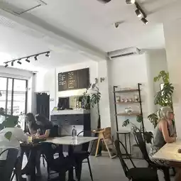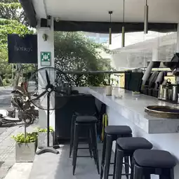 The stylish shop features a white-themed interior, with counter seats outside and many table seats inside.