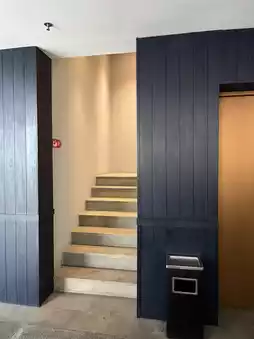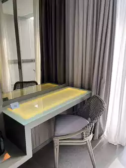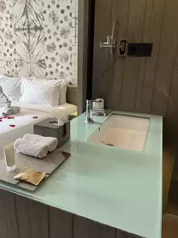 The bathroom was spacious and stylish too! It had a rain shower and a bathtub. The amenities were natural with a great scent. They also provided water and welcome fruit, showing thoughtful attention to detail.