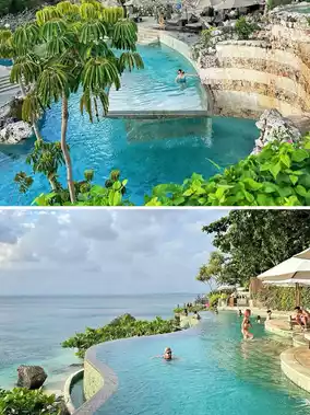 When visiting Bali, you must stay at this iconic Bali AYANA Resort ~ AYANA Resort Bali is a landmark integrated resort in Bali, located on the cliffs of Jimbaran Bay, covering 90 hectares, known for its magnificent Indian Ocean views and volcanic rock formations. As the flagship property of the Indonesian local hotel group AYANA, the resort includes four hotels: Bali AYANA Resort, Bali AYANA Lido Hotel, Bali AYANA Segara Hotel, and Bali AYANA Villas. There are a total of 19 dining venues and 12 swimming pools here. Its core facility, Rock Bar, was rated by CNN as one of the best bars in the world, built on natural reefs, with a particularly famous sunset view.