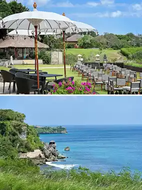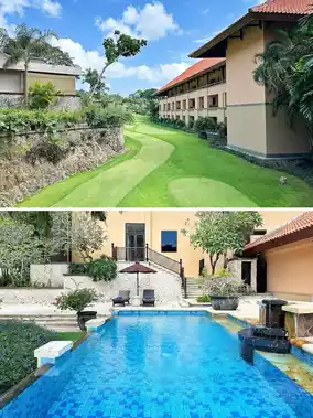 The resort's features lie in its mature integrated facilities and ecological design. In addition to a private beach and seawater spa center, it also has an 18-hole golf course and a 22,000-square-meter marine aquarium project. The room designs blend traditional Balinese style with modern amenities, with standard rooms starting at 78 square meters. Notably, the resort practices sustainability through a seawater desalination system and organic gardens, and has received Green Globe certification.