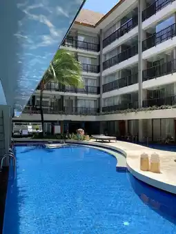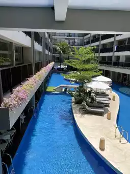 The swimming pool is located in the middle of the hotel, which is shaped like the letter ㅁ.