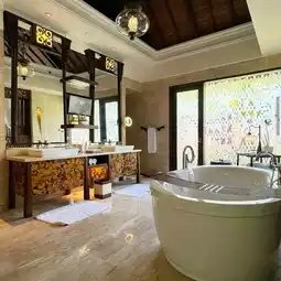 The St. Regis Bali Resort is the epitome of beachfront grandeur, set along Nusa Dua’s pristine coastline. Its sweeping grounds are lush and immaculate, leading to an expansive private beach with soft white sand. The resort offers opulent suites and villas—some with direct beach access, all with elegant furnishings, marble bathrooms, and signature butler service. Lagoon villas open right into a crystal-clear saltwater lagoon, creating a dreamy swim-up experience. Dining is a highlight: Kayuputi offers exquisite haute cuisine, while Boneka serves legendary buffet breakfasts. The Iridium Spa provides a luxurious retreat with custom treatments. The St. Regis excels in service—thoughtful, discreet, and always a step ahead. Evening rituals like champagne sabrage and beachfront fire dances add a touch of theater to the experience. Ideal for honeymooners, families, or anyone seeking refined luxury, The St. Regis offers world-class comfort with a timeless, romantic ambiance.