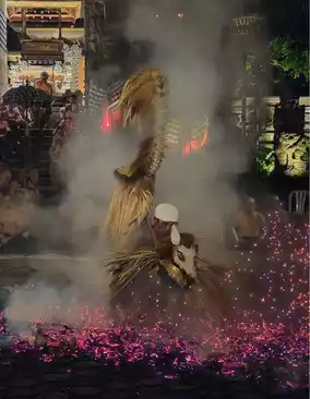 The fire dance is an ancient ritual where dancers barefoot walk on fire, symbolizing fearlessness and purification after being possessed by spirits, representing sacred power.