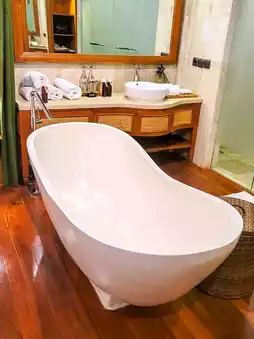 The semi-open bathroom features a rain shower that cascades like a waterfall and a bathtub filled with warm water. It feels like a private garden for both viewing the forest and relaxing.