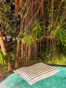 The suites at Bali Ubud Hotel Adiwana Unagi Suite are spacious and decorated with an interior that harmonizes traditional Balinese and modern styles. The rooms are imbued with paintings and woodcraft by Balinese artisans, and the marble floors and high-quality wooden flooring create a calm atmosphere.
