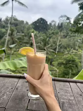 After the jungle, we headed to Uma Ceking, a stunning restaurant overlooking rice terraces. Entry fee: 8(𝐼𝐷𝑅100,000).𝑂𝑛𝑒𝑠𝑚𝑜𝑜𝑡ℎ𝑖𝑒∶8 each. We ordered two, bringing our total here to $24. It wasn't just lunch—it was an experience. Sitting above emerald-green fields, surrounded by music and nature, reminded me how powerful travel can be.