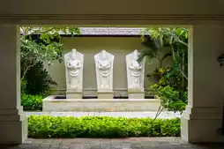 Walking down the hotel’s central axis road, you’ll encounter a carefully preserved 120-year-old Bodhi tree and a replica of the Telowuran ruins. Gardens, fountains, and streams are everywhere, inspired by the royal ceremonial pavilions used for purification during the Majapahit era.