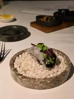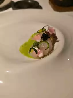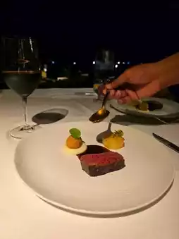 We opted for the nine-course Dinner Degustation tasting menu, meticulously paired by the sommelier with a selection of fine wines. The appetizer consisted of pomelo sorbet and crab meat. Following were snapper sashimi with caviar, lobster dumplings in clear broth, scallop bisque, steamed coral trout with black ink and shallot oil, and vanilla-smoked MB9+ Wagyu beef. Desserts included sago and coconut sorbet and aged black pineapple sorbet with ginger cream, and finally, a petit four dessert. Each dish was beautifully presented, incorporating local ingredients and creative cooking techniques, resulting in a vibrant and vibrant dining experience.