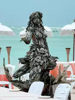 At a Jimbaran beach dinner, there's more than just sunset and candlelight; there's also this wooden goddess, sculpted by the sea and time. She stands quietly in the ocean breeze, her body pieced together from driftwood, a soul sculpted by the ocean itself.