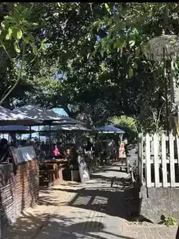 The sandy beach was relatively clean, and beach chairs and parasols (approximately 50K IDR for two people) were readily available for rent. Local warungs near the beach offered dishes like Nasi Goreng and Mie Goreng for around 25K IDR, while cafes across the street provided air-conditioned spaces to cool off. Water sports were limited to activities like kayaking and paddleboarding, making it a quiet and family-friendly destination.