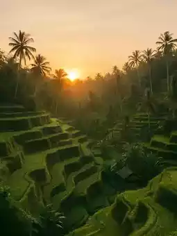 Located north of Ubud in Bali, the Tegalalang Rice Terraces are one of the island's most famous natural landscapes, featuring tiered rice paddies that stretch out in layers. The combination of lush green fields and palm trees creates a stunning view, making it a popular spot for photography enthusiasts.