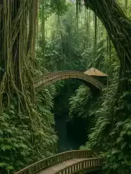 and traditional Balinese temples, bridges, and sacred statues adorn the area,