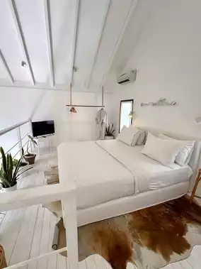 The spacious room with a loft gives a sense of openness, while the fully equipped kitchen allows you to cook and enjoy homemade meals whenever you like. Just outside, a private pool surrounded by greenery invites you to unwind, dip your feet, and embrace the island’s laid-back rhythm.