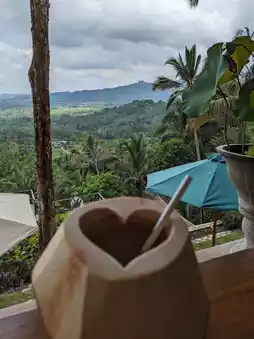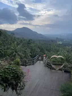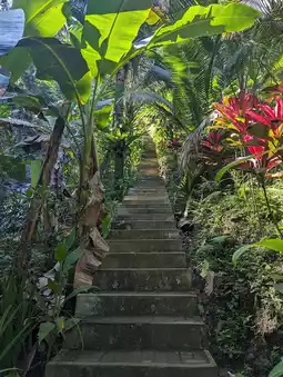 Gembleng offers a peaceful escape and a rare chance to soak in natural tiered rock pools—three levels in total—carved into the cliff face.  The upper pools, especially, feel like a natural infinity tub, overlooking lush landscapes of Sidemen.  The hike is short and steep—around 5-10 minutes up stairs from the parking area—but manageable for most visitors.  Facilities are minimal but include a small restaurant perched above the falls that offers drinks, snacks, views, and basic toilets.