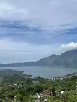 Seated in a bird's nest-shaped seat, you are greeted by the majestic view of Mount Batur and the shimmering lake below. The breeze carries a faint earthy aroma from the rice fields and valleys, naturally slowing your breath.