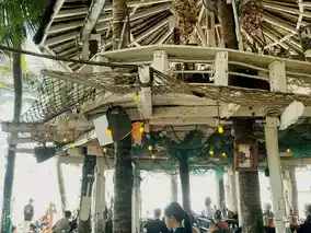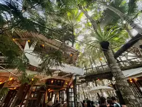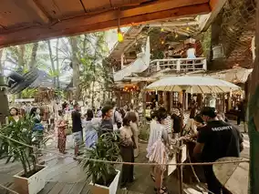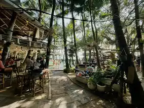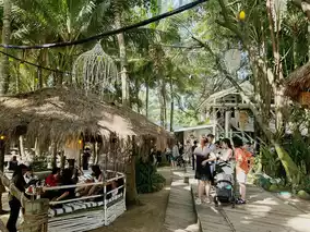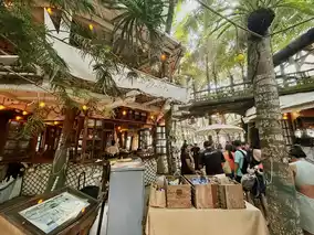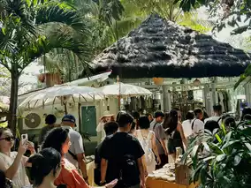 The most captivating aspect of this weekend market isn't just the stalls and aromas, but the building itself, which seems to extend from nature. Bamboo and wood interweave to form the curved roof, allowing light to filter through the gaps, creating a soft, playful effect.