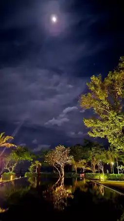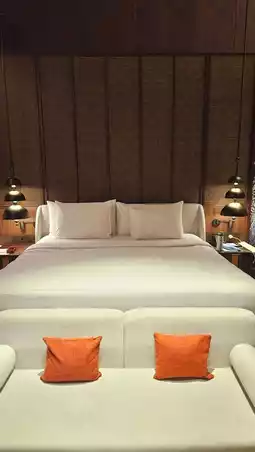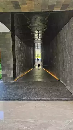Arriving at the Meru introduces visitors to an architecture that brilliantly combines cultural homage with modern comfort. The transition from bright light to the subdued lighting of the lengthy subterranean gallery is truly ingenious. The entry offers a subtle shift in temperature with natural convection at work. Breaks punctuate the gallery wall at cross sections, revealing sculptures under daylight and cascading water: the sound of water is engaging and aids the cooling process. The dramatic textures of stone contrasting with the dark reflective aluminum ceiling are striking. At the gallery's end, a large sculpture and additional water feature beckon visitors forward. The spacious and elegant reception foyer opens to one's left just before reaching the gallery's end. Immediately, staff are there to greet you. Elements of stone, water, and natural light—enhanced by spot-lighting in the evening—are repeated, with timber lattice screens and ceiling panels further beautifying the space. The accommodation wings are exquisitely landscaped to encourage natural airflow. Cross sections are light-filled, green oases. Rooms are thoughtfully designed with cultural sensitivity and architectural elegance. Dark wood paneling, rattan screens and doors, stunning bedside lighting, and cozy seating serve as focal points. Generous proportions are offered throughout the room, ensuite, robe, bathing area, and balcony. Overall, it's marvelous. All staff were professional and delightful. The food and restaurants were outstanding. Amenities—like the pools—are fantastic. Grounds staff are industrious and create art!
