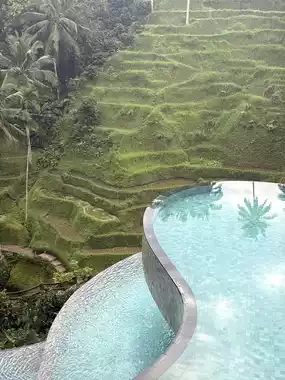Cretya Ubud features a unique three-tiered pool structure, creating the illusion that the rice terraces extend into the water.