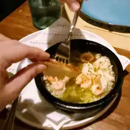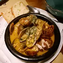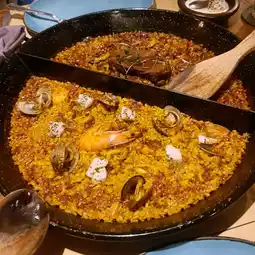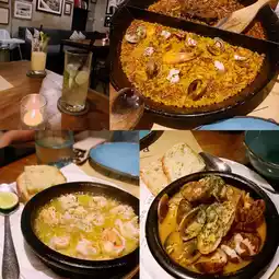 We started with garlic prawns served alongside crusty sourdough bread, followed by Basque-style clams in a sweet and spicy seafood sauce that paired beautifully with the bread too. For mains, we shared a half-and-half paella! This is a clever option for couples who can’t decide! I had the Paella de Marisco (seafood paella) while my husband went for the beef cheeks paella and both were rich, flavorful, and cooked to perfection.