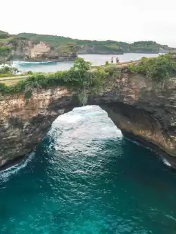 Sheer cliffs created a bridge through which the rough ocean rushes onto an untouched beach. It looks as crazy and beautiful as it sounds!