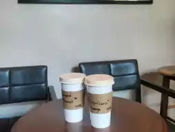 The shop has drinks and cakes ☕🍰 that taste good. 😉