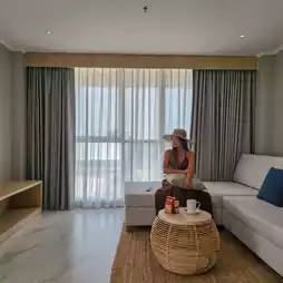 We slept in a 𝙊𝙘𝙚𝙖𝙣'𝙨 𝙀𝙙𝙜𝙚 𝙇𝙪𝙭𝙪𝙧𝙮 𝙎𝙪𝙞𝙩𝙚 𝘿𝙤𝙪𝙗𝙡𝙚 room. The room is spacious with a view of the sea. The room is clearly divided.
