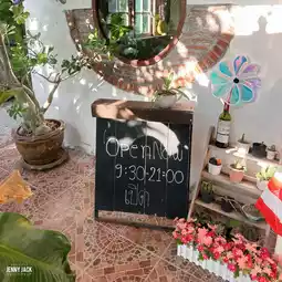 It is a secret cafe located in Soi Kafiws next to Ban Chang Sports Stadium. There are both indoor and outdoor seating areas. There are trees and flowers, giving a warm feel. Inside, there are only cute corners. I even saw the shop's cat, which is super cute. 🐈