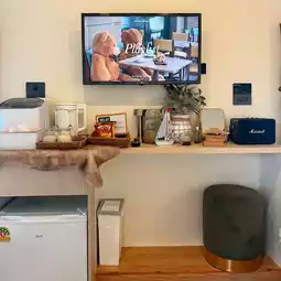 A smart TV, refrigerator, kettle, ice maker, hair dryer, and Marshall speakers are all included.