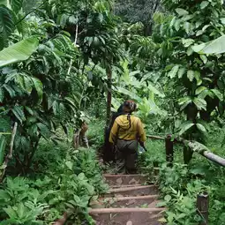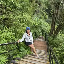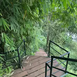 You can enjoy the waterfall view from the wooden bridge. Don't even think about walking on it if your shoes don't have treads. And once you've had your fill of the view, get ready to climb back up the stairs! 🙌🏻