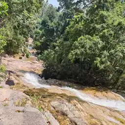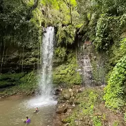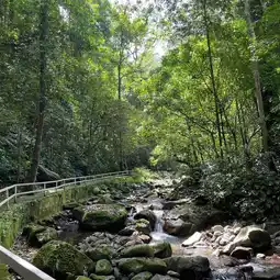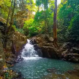 Kawang Waterfall runs through a secluded path in the tropical rainforest. Underfoot is a narrow path covered with fallen leaves. The towering branches are intertwined to form a blue sky, and occasionally a few rays of warm sunlight jump out from the gaps. We can hear the sound of gurgling water not far away, as if inviting us to find out what's going on.
