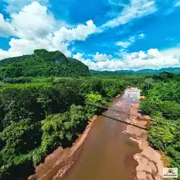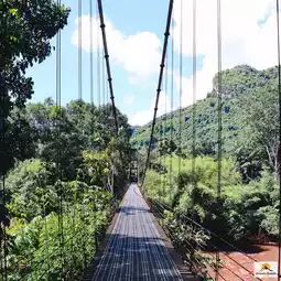 🌉🌿❤️Khao Phang Suspension Bridge, or its full name, Ban Khao Theppitak Suspension Bridge, is a small cable-stayed bridge across the river. It is approximately 120 meters long and you can see the Heart-shaped Mountain or Theppitak Mountain from the bridge.