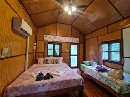 Bansuan Phutarn is a charming accommodation that offers a serene atmosphere. Located by a stream, it provides stunning views of mountains and cliffs. The room we booked was a standalone house equipped with air conditioning and convenient amenities. In front of the room, there was a hammock where we could relax and enjoy the scenery. The ambiance was delightful, though mosquitoes were quite prevalent at night.