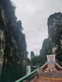 ✨ We reached the resort base by boat. During the water journey across Cheow Lan Lake, we marveled at the majestic cliffs.