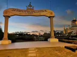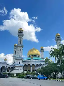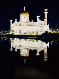 The mosque's golden dome are covered in real gold leaf. The mosque has a 52m-high minaret makes it the tallest building in central of Bandar Seri Begawan. The mosque has a ceremonial stone boat sitting in the lagoon is a replica of a 16th-century mahligai (royal barge).
