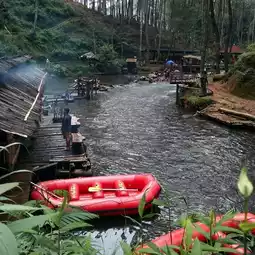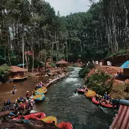 Singkur Village is located in Pangalengan, Bandung. This natural tourist location is very beautiful, surrounded by rows of towering pine trees. This creates a very cool air and air. In addition to its amazing nature, Singkur Pangalengan Village will also provide you with a variety of exciting and fun tours that are hard to forget. The various tours that are presented are, of course, nature-themed, such as white water rafting, tubing trips, camping, paint ball, and other exciting activities. This tourist spot is perfect for those of you who want to return to nature and enjoy natural relaxation. Although to get to the location you have to walk first, but Kampung Singkur Pangalengan is very appropriate to invite all family members. The distance taken to this tourist location, from the city of Bandung is approximately 50 kilometers or about two hours drive. The route to Singkur Pangalengan Village can be via the Soroja toll road or through the Moh. Toha. The route to this tourist location is treated to a very beautiful view. The expanse of green tea gardens and stunning views are the main sights during your trip. The cool air and refreshing air always accompany you. The route that you can take can be through Situ Cileunca and heading towards Pinus Rahong via Jalan Raya Rahong. To avoid getting lost, you can follow the directions, or ask the locals you meet along the way. The operational hours of Kampung Singkur Pangalengan are currently open every day from 07 am to 07 pm. The location of Kampung Singkur Pangalengan has a very clean and very beautiful river, the flow of this river is arranged in such a way by the manager so that it can attract the interest of visitors.
