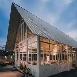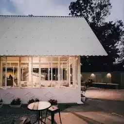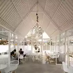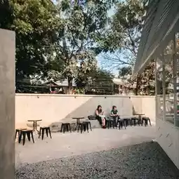 There's a new Glass House coffee shop in the Buah Baru area, folks. The glass architecture is the main highlight of this coffee shop. However, it's surrounded by quite a spacious outdoor area. The evening ambiance with the lights adds to its coziness. It's perfect for hanging out with friends. Oh yeah, mostly it's open-air here, so it feels really nice especially in the evening. They're also preparing several air-conditioned meeting rooms for those who want to work from here during the day.