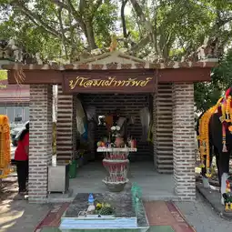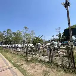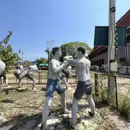 Today we will take our friends to visit Samut Songkhram Province. After paying homage to the sacred objects of Wat Bang Kung, near Wat Bang Kung there is also a replica wall of Bang Kung Camp, located in Bang Khonthi District. Inside the camp, there are statues of Muay Thai fighters. Each pair of statues is a different Muay Thai pose for Thais and foreigners to study. It is also home to the monument of King Taksin the Great. 🚗Convenient parking available