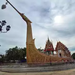 🏠 The ordination hall, designed as the world's largest Suphannahong Royal Barge, was constructed in 1983. Phra Khru Nonthapanyawimon envisioned a royal barge floating in front of the old ordination hall, inspiring its creation.