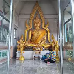 ⛺ The small vihara and donation pavilion house various Buddha images, sacred objects, and items for merit-making, including Loknimit stones for gold leaf application, statues of Thao Wessuwan, Jatukam Ramathep, and other revered figures.